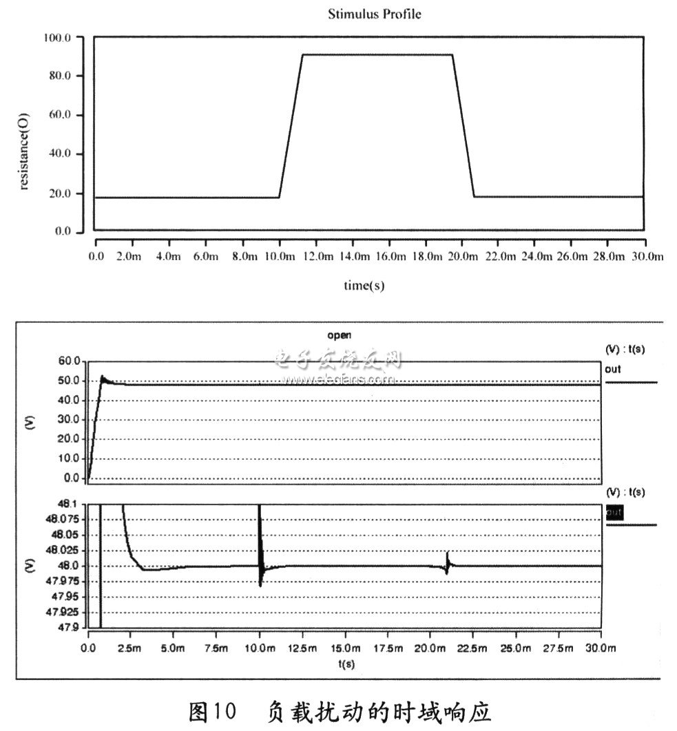 用SABER进行时域分析,观察输入电压与负载扰动时的系统性能,见图9和图10。