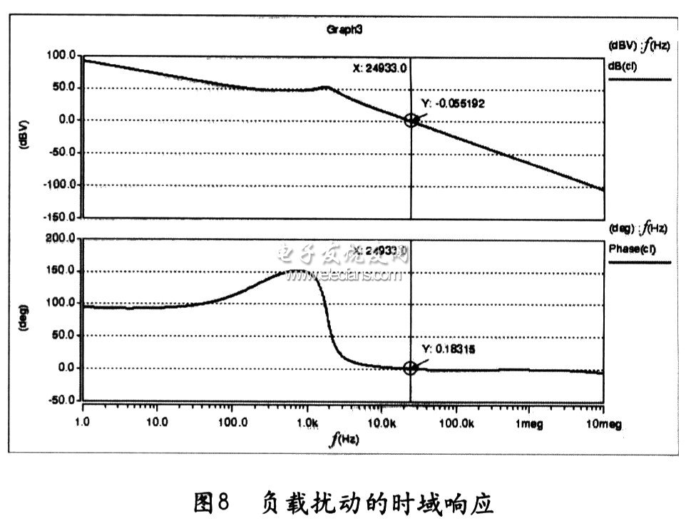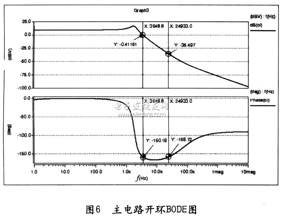 使用SABER得出补偿后的开环BODE图如图8所示,注意在SABER进行小信号分析前,需微调占空比参考电压,使比较器反相输入端静态工作点在5V,否则可能饱和。
