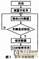 自动跟踪系统软件由界面程序、信号处理程序和控制信号输出程序等三部分组成。信号处理程序实现了单片机对GPS信号的采集、解析等以及通过GSM网络向用户发送车辆定位信息等,是软件程序的重点;界面程序主要完成手机号设置、键盘处理、液晶显示等,实现了与用户良好的沟通;控制信号程序实现对GSM信号的接收与分析,完成对车辆的点火开关的控制;其软件总框图如图3所示。