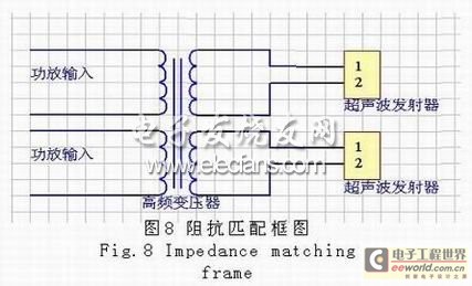 本系统中的阻抗匹配采用的是一个高频变压器,功放的输出经过高频变压器的耦合以后加在超声波换能器上,如图8所示,取得了较好的匹配效果。