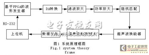 系统原理如图1所示。用现场可编程逻辑门阵列(FPGA)芯片,通过直接数字频率合成(DDS)技术产生频率为1kHz~100kHz的波形信号;功率放大采用功放模块;功率放模块的输出通过输出变压器和电感组成的匹配网络驱动压电换能器激发超声波。