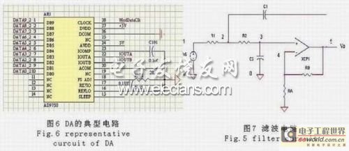 本系统中,考虑到系统在高频时要求DA的转换速度较快,所以选用了DA公司的AD9750,它是10位的DA芯片,具有125MSPS的转换速度,其典型接法如图6: