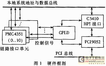 数据采集芯片采用了PMC公司的PMC4351.它可以同时采集三个时隙上的数据,可以通过编程选择采集或输出T1、E1数据,支持HDLC协议,可以进行去除CRC标志、复帧标志等预处理,为每小时隙提供128字节的发送FIFO和接收FIFO,有很完善的处理器接口。为了能够同时采集一整条E1链路上的数据,本系统采用了11片PMC4351组成链路数据接口单元。各个芯片之间的接口利用CPLD来完成,它的可编程性为各个组成部分之间的控制和通信提供了相当大的灵活性,也省去了大量外部电路、保证了硬件的方便调试和稳定工作。