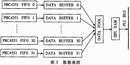 数据的采集与预处理需要在C5410数据存储器中开辟三种存储块:一种是DATA BUFFER,它与PMC4351中各个时隙的FIFO一一对应,用于缓存每个时隙上采集到的消息数据;第二是DATA POOL(大小为1000H字),这是一个消息数据地,消息数据在DATA BUFFER中存满一整条消息后,加上一些TS包头后,形成一个新的消息包,存入到DATA POOL中;另外还要再开辟一个大小为1000H字节的存储块HPI RAM,这样就将DSP的数据采集部分与上层系统通信部分相互隔离开来,互不干扰。在DATA POOL中存满数据后,形成一个大的数据包,交给HPI RAM,通过PCI总线交给上层系统,进行进一步处理。整体的数据流图如图3所示。