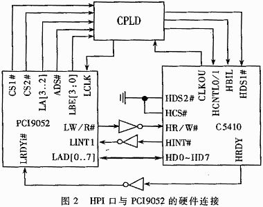 在这种配置方法下,PCI9052和HPI口之间的硬件连接,主要利用PCI9052的读写控制信号ADS#、LBE[30]#、LW/R#、LRDY#和部分地址信号LA[32]进行简单的时序和逻辑转换后来生成HPI口的读写控制信号HBIL、HDS1#、HCNTL0/1、HR/W#.由于HPI口的访问时钟是C5410的外部频率CLKOUT的5分频,所以PCI9052的本地时钟采用CLKOUT/5.