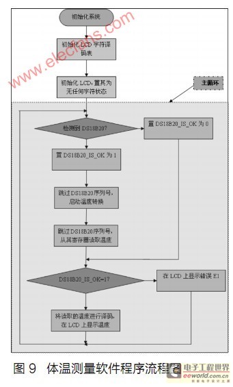 将本文提到的设计方案投入实践中,最终完整实现的功能是体温测量,在此给出体温测量的软件程序流程图如图9所示。