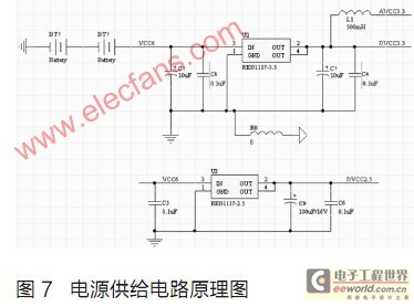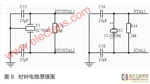 系统控制模块中,所包含的电源供给电路、时钟电路、复位电路、键盘控制电路等需要的器件都可参考由北京时代民芯科技有限公司提供的MXT8051开发板上的成熟产品,借鉴其接口方式并稍作修改,可满足预期要求。其中稍作修改的电源供给原理图及时钟电路原理图如图7、图8所示。
