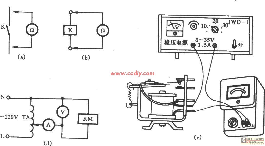 (3)测量直流继电器吸合、释放电压电流。选用一台0~35V直流稳压电源,将万用表打在100mA直流挡,串入继电器线圈回路中,如图(c)所示。调节稳压电源的调压旋钮,使电源电压从低逐渐升高。当刚听到衔铁“嗒”一声吸合时,记下吸合电流和电压值(用另一电压表);然而吸合电压和电流不是很固定的,须多作几次,取其平均值。然后再调动调压旋钮,使电压下降,至刚听到“嗒”的一声,则为继电器的释放电压和电流值。