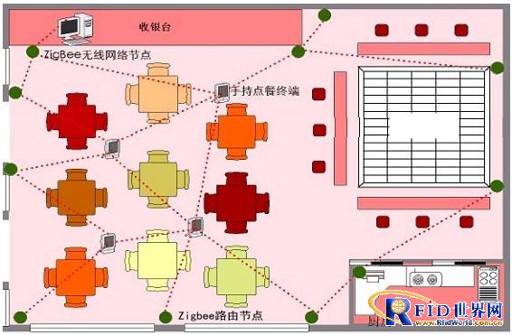 餐厅ZigBee 无线节点网络,通过在餐厅、吧台、厨房、收银台、处理中心部署的 ZigBee节点设备构成了完整的无线通讯网络,实现了信息处理的自动化。