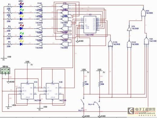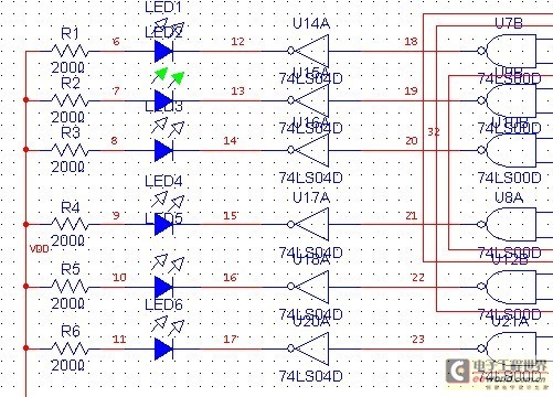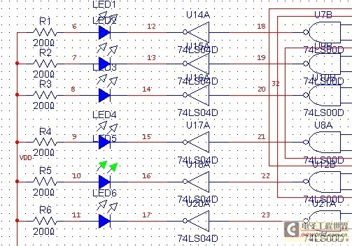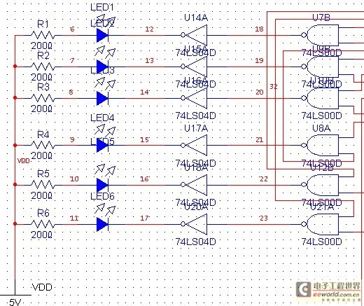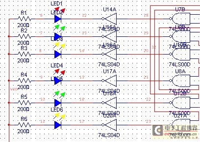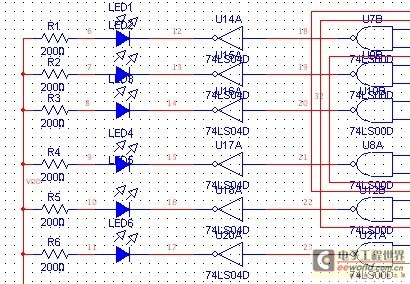 使用发光二极管来显示运行结果。发光二极管正端接5V电源,当非门的右边输入的是高电平,则经过非门以后变成低电平,则发光二极管亮;当非门的右边输入的为低电平,则经过非门以后变成高电平,则发光二极管熄灭。