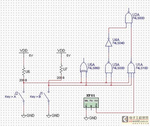 开关两端一端接高电平,一端接地(低电平)。74LS86D与74LS138的输入控制端连接,当开关同时闭合或断开的时候,输入相同,74LS86输出为“0”,则74LS138不译码。若两开关同时断开,则74LS04D的输出为“1”;而74LS10D接有CP脉冲,所以此时74LS00D的输出完全决定于CP脉冲;当两开关同时闭合,74LS00D输出为“1”; B开关打开;B开关闭合,A开关打开时的分析也按照上面的方法来分析实现。