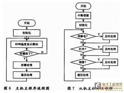 该系统软件部分主要完成了系统及各个模块初始化、警情信号检测(火警/盗情)、系统设置、RS 485总线协议及声光报警的程序设计。具体的程序流程图如图6,图7所示。