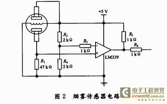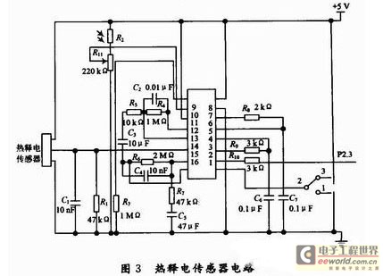烟雾传感器的内部电阻是随着烟雾的浓度的变化而变化,因此要将其转化为变化的电压信号,在此通过电压比较器LM339和几个相应的分压电阻构成,具体电路设计如图2所示。在通电状态下测得传感器的内阻是130 kΩ左右,在烟雾较浓时内阻为6 kΩ左右,在无烟时比较器的负端输入为2.5 V左右,正端为1.2 V左右,有烟雾时负端为2.5 V,正端为3~5 V,此电路能很好地实现电平的转换。热释电红外传感器采用RE200B和信号处理元件BISS0001及少量外接元件组成,电路如图3所示。