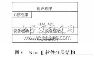 NiosⅡ的软件开发一般采用分层的方式进行,它采用类似Linux的设备文件系统来管理设备,采用HAL(硬件抽象层)完成硬件相关设备的封装操作,因此每个CPU外设都需要有相应的驱动程序。虚拟示波器系统中,NiosⅡ的驱动分层结构如图6所示。