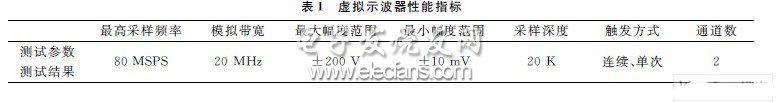 采用FPGA处理器和ALTERA公司的NiosⅡ软核完成虚拟示波器系统设计后,进行了多次测试,其性能指标如表1所示。