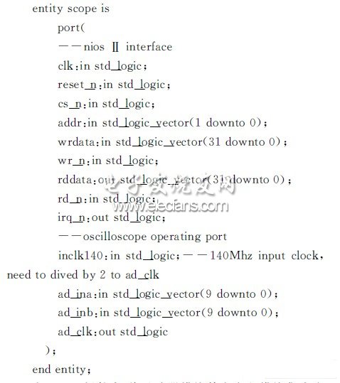 进行基于Nios Ⅱ 的SOPC 系统开发时,可利用ALTERA提供的SOPC插件,进行外设和CPU的配置,并提供自定义IP的构建方法。在虚拟示波器系统中,需要开发符合AVALON总线的示波器模块,并加入到自定义IP中。示波器模块实体程序如下: