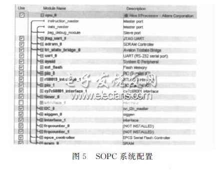 在SOPC插件中,将示波器模块等自定义模块集成为IP核,分别将NiosⅡJTAG_UART、FLASH以及SRAM等IP核加入虚拟示波器系统中,SOPC系统配置图如图5所示。