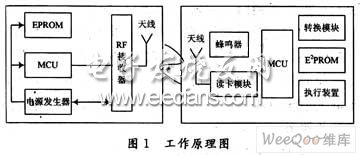 典型的射频识别系统的工作原理如下:系统通电工作后,读出器通过其内部的线圈周期性地发出一个固有频率的电磁波(激发信号)。当射频识别卡放在读出器的感应范围内时,卡内的线圈在“激发信号”的感应下产生微弱电流作为卡内集成芯片的电源。卡片上电复位后,原本处于“休眠状态”的卡片被激活并将含有自身种类识别码标志、制造商标志等信息代码调制到载波上,经卡内天线发射出去。读卡模块将接收到的无线信号传给现场控制器,由现场控制器进行信号处理并对执行装置发出指令。读出器采用微处理器控制,通过韦根一485转换模块实现与主控机之间的信息交流,其原理框图如图1所示。