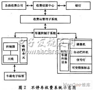 ETC系统主要由ETC收费车道、收费站管理系统、ETC管理中心、专业银行及传输网络组成。车道控制子系统用于控制和管理各种外场设备与安装在车辆上的电子标签的通信,记录车辆的各种信息,并实时传送给收费站管理子系统。收费站管理子系统负责收集管理传送过来的数据。ETC管理中心是ETC系统的最高管理层,既要进行收费信息与数据的处理和交换又要行使必要的管理职能,它包括各公路的收费专营公司、结算中心和客户服务中心,根据收到的数据文件在公路收费专营公司和用户之间进行交易、拆账和财务结算,配有多台功能强大的计算机,完成系统中各种数据、图像的采集和处理。图2为其结构框图。