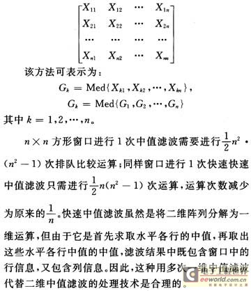 为提高图像处理速度采用一种快速中值滤波的算法,设n×n个像素方形滤波窗口为: