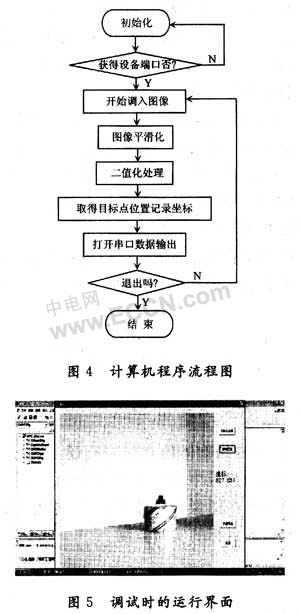 CCD采集获得的图像为8位位图格式,本文采用可视化编程软件VC++实现图像预览以及处理。处理后的数据经串口输出给控制部分。计算机的程序流程图如图4所示。