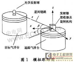 通过星座仿真可以得出,星座的相对运动的特点,应用面阵CCD来完成星座的相对运动的跟踪是一种新的跟踪方法,它使硬件变得简单,大部分数据处理都由软件来实现,使得跟踪达到速度与精度的完美结合。本文旨在用2个气浮台来模拟星座的相对运动。以目标气浮台上的光学反射球作为跟踪目标,位于追踪气浮台上的面阵CCD用来实时测得包含运动目标的图像信息传送到计算机;再由计算机进行处理得到运动目标位置信息、相对距离和方位;把测得的数据由串口输出给控制单元,进行精确的测量从而实现检测跟踪的目的,模拟跟踪如图1所示。