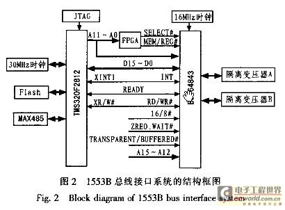 BU-64843与微处理器或外部存储器接口非常灵活,可与8位、16位多种微处理器相连接,并且可以实现无缝连接或者只需很少的粘和逻辑电路。BU-64843有2种工作模式:透明模式(TRANSPARENT)和缓冲模式(BUFFERED)。当BU-64843准备好时,就输出READY信号。16位缓冲模式是最常用的接口形式。提供一个与16位或32位微处理器共享RAM的缓冲器接口,在这种接口中,BU-64843的内部地址/数据缓冲器使其与微处理器的地址,数据隔离。在该模式下将引脚16/8#置为高电平,TRANSPARENT/B-UFFERED#置为低电平,ZERO_WAIT#置为高电平。工作在缓冲方式下,占用16位数据总线和12位地址总线,其所有的控制信号由FPGA的译码电路产生,通过中断方式与F2812通信,因此BU-64843的中断引脚INT与F2812的外部中断XINTl连接;BU-64843总线接口有2个数据通道,通道A和通道B,这是为了保证通信的可靠性而采取的冗余设计,在实际的工程中也使用2个通道,通过软件选择任意通道进行数据传输。BU-64843通过2个耦合变压器PM-DB2755与外部的屏蔽双绞线连接:16 MHz有源晶振作为时钟输入。