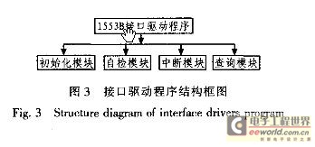 驱动程序的编写采用C语言与汇编语言混合编程的实现方法,兼顾二者的优点,使程序既有C语言较好的可读性和可移植性,又有汇编语言较高的效率。驱动程序从本质上说,就是根据上位机的命令和要求,控制接口卡的工作,实现系统的启动、停止、自检以及自检结果的返回等,在系统启动后主要实现1553B总线数据的接收和发送。整个驱动程序的组成如图3所示。