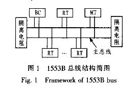 1553B总线采用异步、半双工方式传输,传输速率1 MB/s。1553B总线传输协议规定的传输过程为:BC向某一终端发送一个接收/发送指令,RT在规定的响应时间内发回一个状态字并执行消息的接收/发送。1553B采用双冗余总线,有2个传输通道,保证了良好的容错性和故障隔离。如果当前总线的数据传输出现错误或故障,数据可以自动从冗余总线上传输。1553B总线的传输介质为屏蔽双绞线。其总线结构简图如图l所示。