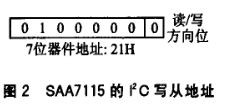 需要注意的是,在DM642的I2C应用中经常会遇到不能正确读/写从设备的问题。这是因为DM642对I2C模块的从地址寄存器设置不同于其他芯片的I2C应用。在标准I2C协议中,器件的7位地址格式要将地址和读/写方向位一同送入从地址寄存器。但是,DM642的I2C的应用中只需要向从地址寄存器中送入7位器件地址,读/写方向位由DM642自动生成。例如,SAA7115的标准I2C写从地址为40H,如图2所示。