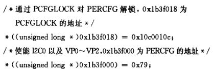 在DM642的I2C应用中,容易遇到不能使用初始化I2C模块的问题,原因在于没有先解锁并使能I2C模块。在DM642的数据手册中可以看到,复位后I2C模块是处于锁定禁止状态的。也就是说,在硬件配置寄存器PERCFG中的I2CoEN位为0,所以在初始化前要在配置I2C模块控制寄存器之前,使能I2C模块。但是,如果要修改PERCFG中的内容,就要先向PCFGLOCK中写入0x10C0010C,对PERCFG解锁。通讨加下程序使能I2C模块: