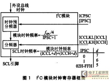 在使能I2C模块后,就可以对其控制寄存器进行初始化了。CPU时钟频率为600 MHz,I2C模块规定模块时钟频率必须在7~12 MHz中选值,所以设定I2C模块时钟频率为10 MHz。由图1中的计算公式可得:IPSC为OEh。由于DM642和SAA7115都支持I2C总线的400 kbps快速模式,根据IPSC的取值,由图1可知d=5。由此可以设定:ICCL=7,ICCH=8。