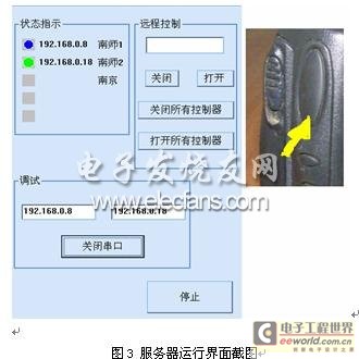系统的调试过程中,我们用了2个无线电台及服务器进行测试。服务器运行界面截图如图3所示。我们设置2个无线电台网络控制器终端的IP地址分别是192.168.0.8和192.168.0.18。按下对讲机的PPT按键时,指示灯由绿灯变成蓝灯,表明服务器进入转发状态。如果想隔离某个控制器,不让其接受或转发信号,则在远程控制的框中,输入对应的IP地址,然后选择关闭,则可以对其进行隔离。