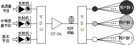 图5是利用WDM方式提供差异化服务的CATV系统实例,其中不同波长承载不同服务质量的CATV信号,每一波长对应同一类型需求的用户群,其中增益平坦光放大器(GF-OA)是为了克服各波长光信号的传输损耗和分波损耗。当网络的差异化服务程度较高且用户数较多时,使用GF-EYDCFA能够有效降低OA的单位功率成本。光迅科技1W和0.5W输出的GF-EYDCFA产品已成功应用于类似的CATV系统。