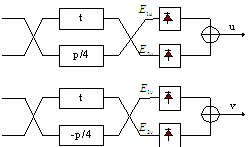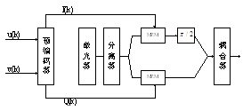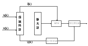 一个DQPSK发射机包括一个DQPSK调制器,两个调制驱动器和一个预编码器。输入光载波信号(u(k),v(k))经过预编码器后变成(I(k),Q(k)),其中I(k)为同相部分,Q(k)为正交部分,如下图所示: