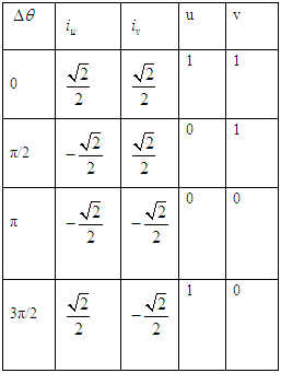 因此,这样就存在四种状态,对应于四种比特组合,见表1,这样就解调出了u和v。