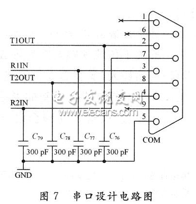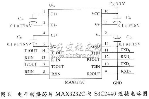 S3C2440有3个UART通道,利用其中一个通道设计串口,使其与GPRS模块连接,由于S3C2440自带的UART控制器,使得硬件开发和软件设计都比较简单。但RS 232标准所定义的高、低电平信号,与一般的微控制器系统的电路所定义的高、低电平信号完全不同,如S3C2440系统的标准逻辑“1”对应电平2~3 V,标准逻辑“O”对应0~4 V电平。显然,与RS 232标准所述的电平信号完全不同。两者之间要进行通信,必须经过信号电平的转换,目前常使用的电平转换芯片有MAX232,MAX3221和MAX324.3,具体设计电路如图7和图8所示。