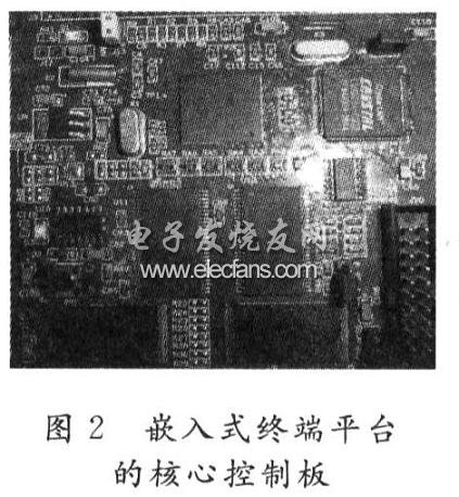 系统首先通过S3C2440微处理器控制CMOS摄像头采集图像数据,经过压缩编码后,再通过GPRS无线发射模块将压缩后的数据发射出去,在服务器端的PC机通过GPRS接收模块接收数据,并通过相应的应用程序,对视频数据进行解码,并通过屏幕显示出来。其中包含有S3C2440微处理器的嵌入式终端平台的核心控制板如图2所示。