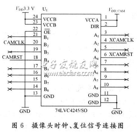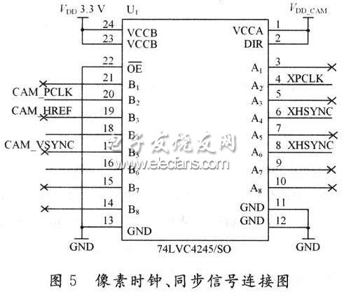 其中用到了TI公司的电平转换芯片74LVC4245,是一种双电源的电平移位器,电平移位在其内部进行。5 V端用5 V电源作为VDD_CAM,而3.3 V端则用3.3 V作为VCC33。双电源能保证两边端口的输出摆幅都能达到满电源幅值。
