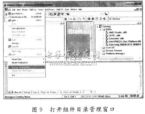 (1)导入BSP开发包。由于用的是三星公司的基于ARM920T核的S3C2440,所以在BSP包中找到SMDK2440文件下的SMDK2440.CEC文件将其导入。打开“Platform Builder5.0”,选择“File”菜单下的 “Manage Catalog Features”,如图9所示。在弹出的对 话框中单击“Import”,浏览到SMDK2440文件下的 smdk2440.cec文件,将其导入。