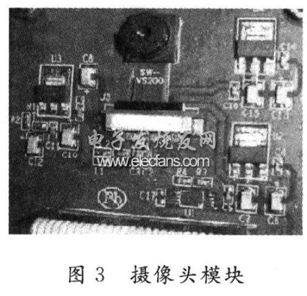 该芯片支持RGB(4:2:2),YUV(4:2:2),YCrCb(4:2:2)三种数据输出格式,内置138个设备控制寄存器,地址分别从Ox00~Ox8A,通过SCCB接口可以方便地设置传感器视窗大小、增益、白平衡校正、曝光控制、饱和度、色调等参数。包含有图像传感器OV9650摄像头模块如图3所示。