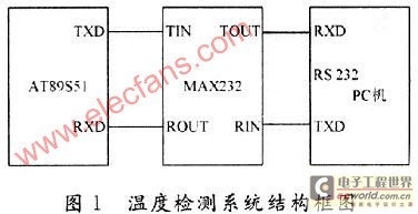 该系统的下位机选择Atreel公司的AT89S51单片机作为控制核心,负责采集现场温度值。温度传感器将温度转换为电压信号,经模/数转换器ADC0809转换成8位数字量,并经AT89S51的P1口进入单片机保存。上位PC机通过串行口与下位机联络,向下位机发送控制命令和接收下位机上传的数据以及进行人机交互。上位机采用VB 6.0进行人机交互界面设计,并利用其MSComm控件实现与下位机简单而高效的串行通信。充分发挥了单片机在实时数据采集和PC机对图形处理、显示以及数据库管理上的优点。使得单片机的应用已不仅仅局限于传统意义上的自动监测或控制,而是形成了以网络为核心的分布式多点系统的发展趋势。由于上下位机串行口工作电平不一致,它们之间通过MAX232芯片将单片机TTL电平转换为RS 232电平,构成如图1所示的系统结构框图。