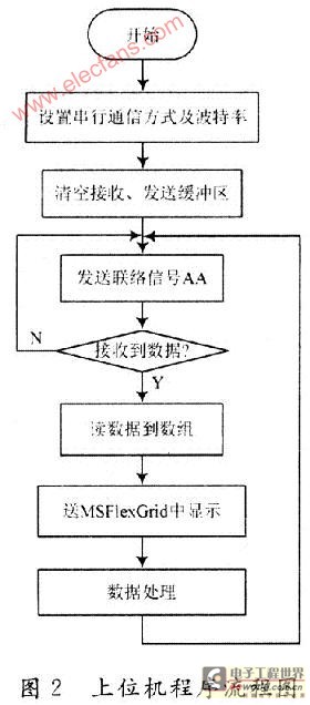 上位机主要负责发送控制命令,以及数据的接收、处理、计算、数据的显示等功能。上位机程序分为四个部分:界面设计、程序初始化、数据通信、数据处理。程序流程如图2所示。