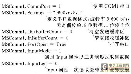 (2)Settings属性用于设置初始化参数。以字符串的形式设置或返回联机速率、奇偶校验、数据位、停止位等4个参数。其格式为:“BBBB,P,D,S”。其中,BBBB表示联机速率;P表示奇偶校验位检查方式;D表示数据位数;S表示停止位数。该系统设其为“9600,N,8,l”。