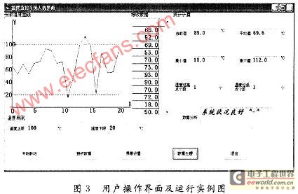 其中,温度界限部分主要用来显示用户自己设定的温度上下限;数据接收部分采用外部控件MSFlexGrid来显示已经接收过来的数据;统计计算部分用来显示对数据分析后的结果,如最大值、最小值、平均值等,最后对当前系统状况作出综合评判;温度曲线部分显示当前所有温度的变化情况,每个温度值对应曲线突出的一点,其中两条虚线内的点代表温度值在界限范围内,两条虚线外的两个点则表示该温度值超出了界限范围。