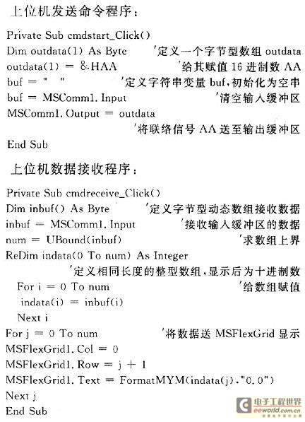 该程序由数据发送(联络信号)和数据接收组成。两部分程序分别写在对应的命令按钮“开始联络”、“接收数据”的Click事件下。具体程序代码如下: