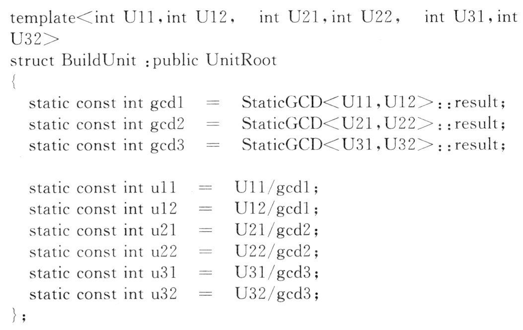 在Osprey方法中,量纲是用一个长度为7的向量表示的,每个分量对应一个SI标准量纲。TADA方法中也采用了这种方式。为了简化阐述,本文只讨论长度、重量、时间这三种量纲,其SI单位分别为米、千克和秒(TADA方法可直接推广到其他各种量纲)。由于TMP程序的特殊性,它并没有数组或向量的支持,也不能使用浮点数据(使用浮点数表示量纲也会带来不精确性),量纲在TMP程序中的表示形式有所不同:用u11,u12,u21,u22,u31,u32之类的整型量分别表示