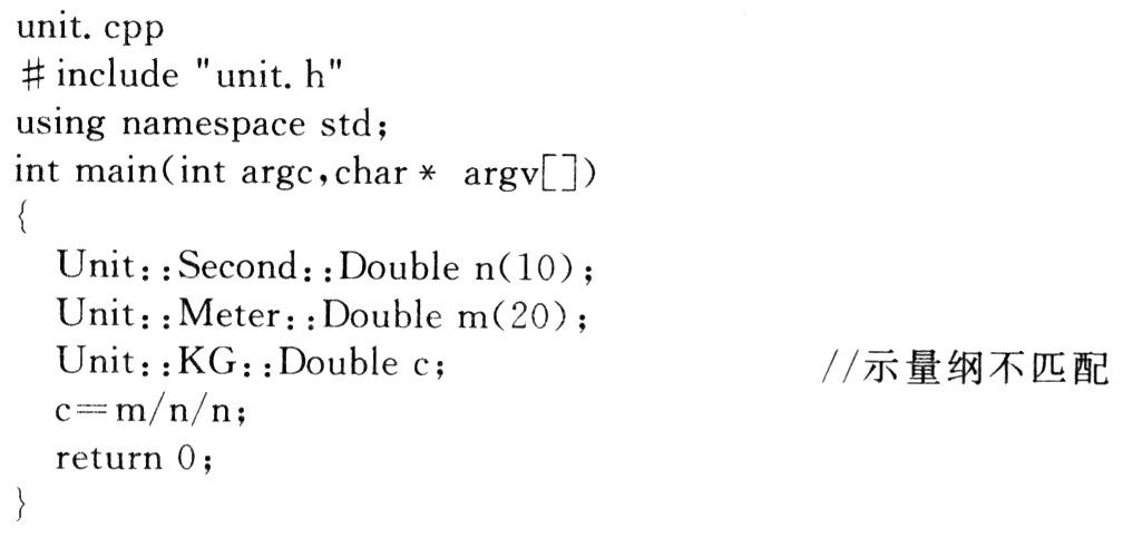 标注实质上是把语言原始的数据类型替换成TADA方法预定义的模板类,而模板类实现了各种运算符号的重载,同时禁止了任何隐含的类型转换,使得量纲标注既满足语法要素的要求,又满足计算兼容性的要求和禁止隐含转换的要求。TADA方法中标注的实现如下所示。
