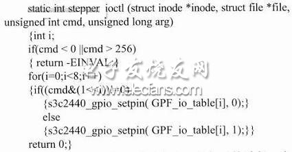 系统中的步进电机只响应应用程序传送给驱动的步进量和部分参数,只能顺序地进行控制操作,因此它可作为字符设备来进行驱动。在驱动程序中,需要提供几个操作函数的入口点,分别为open、read、write、ioet1等。而ioct1函数尤为重要,系统通过调用这个函数可以控制步进电机的转动。