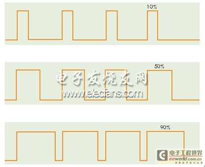 用数字方式控制模拟电机电路的一种典型方法是采用脉冲宽度调制(PWM)。此时方波的时间周期是恒定的,而接通时间(TON)即信号保持高电平的时间可以被改变或调制。因此,信号的占空比或平均直流电平是变化的。借助于数字系统的支持,PWM已经成为控制模拟电路的一种极好方式。图1就是数字脉冲的接通时间改变的例子。